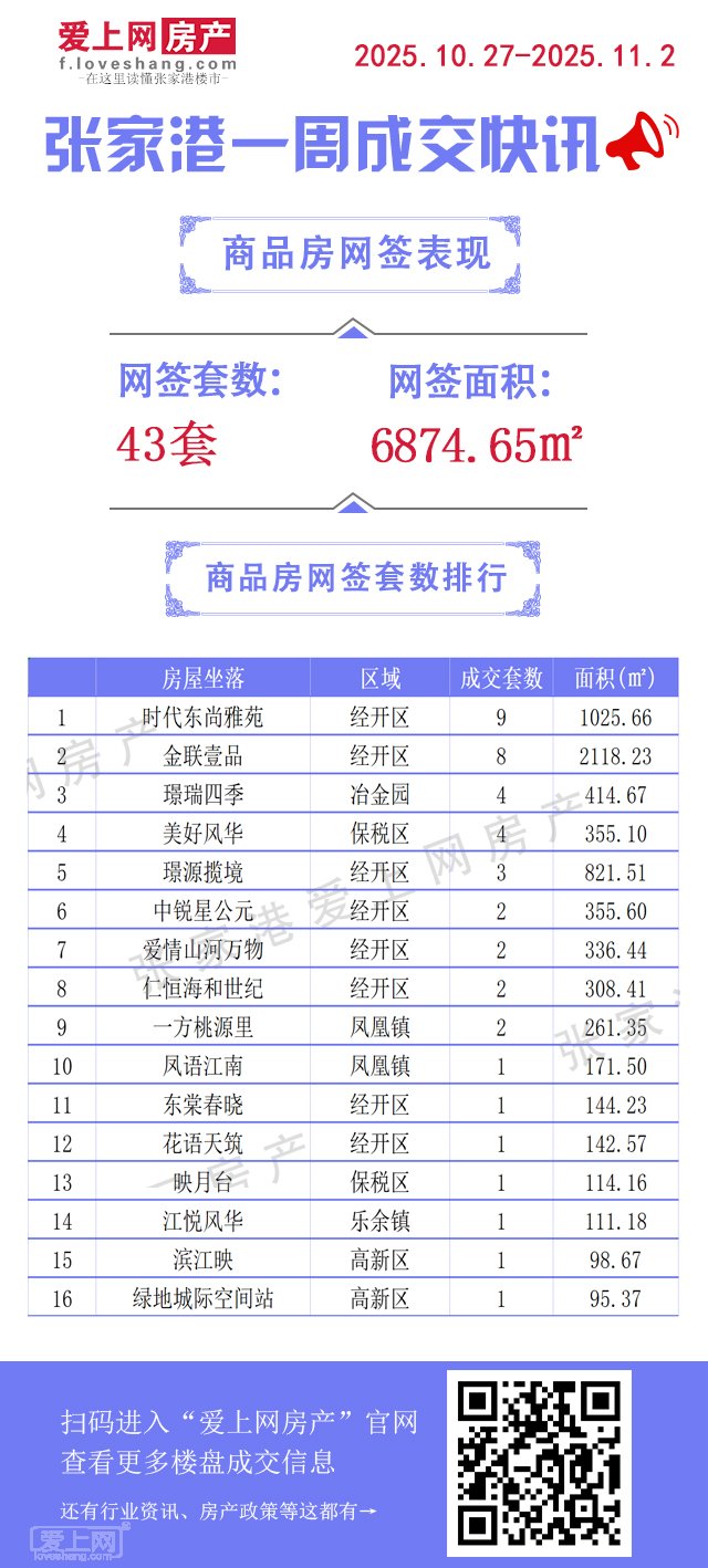 正文摘要:據(jù)張家港愛上網(wǎng)房產(chǎn)統(tǒng)計,2025年10月27日-2025年11月2日張家港商品房共網(wǎng)簽43套,面積6874.65平方米。 |