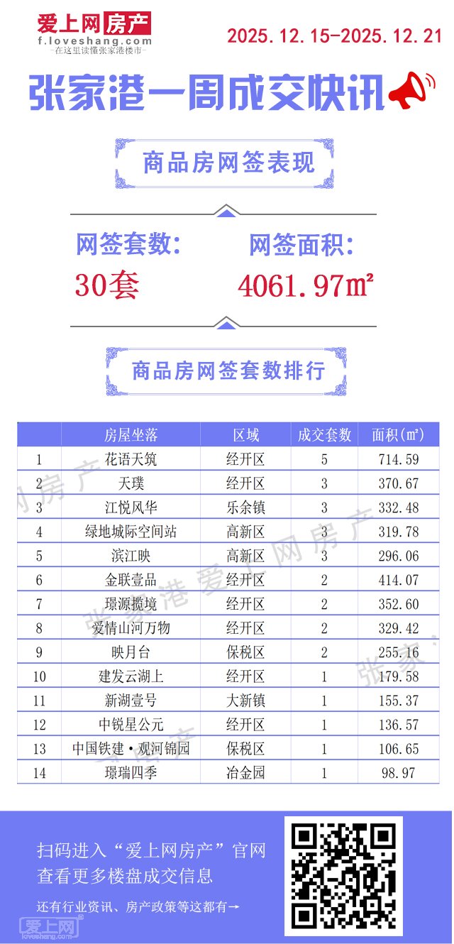 正文摘要:據(jù)張家港愛上網(wǎng)房產(chǎn)統(tǒng)計,2025年12月15日-2025年12月21日張家港商品房共網(wǎng)簽30套,面積4061.97平方米。 |