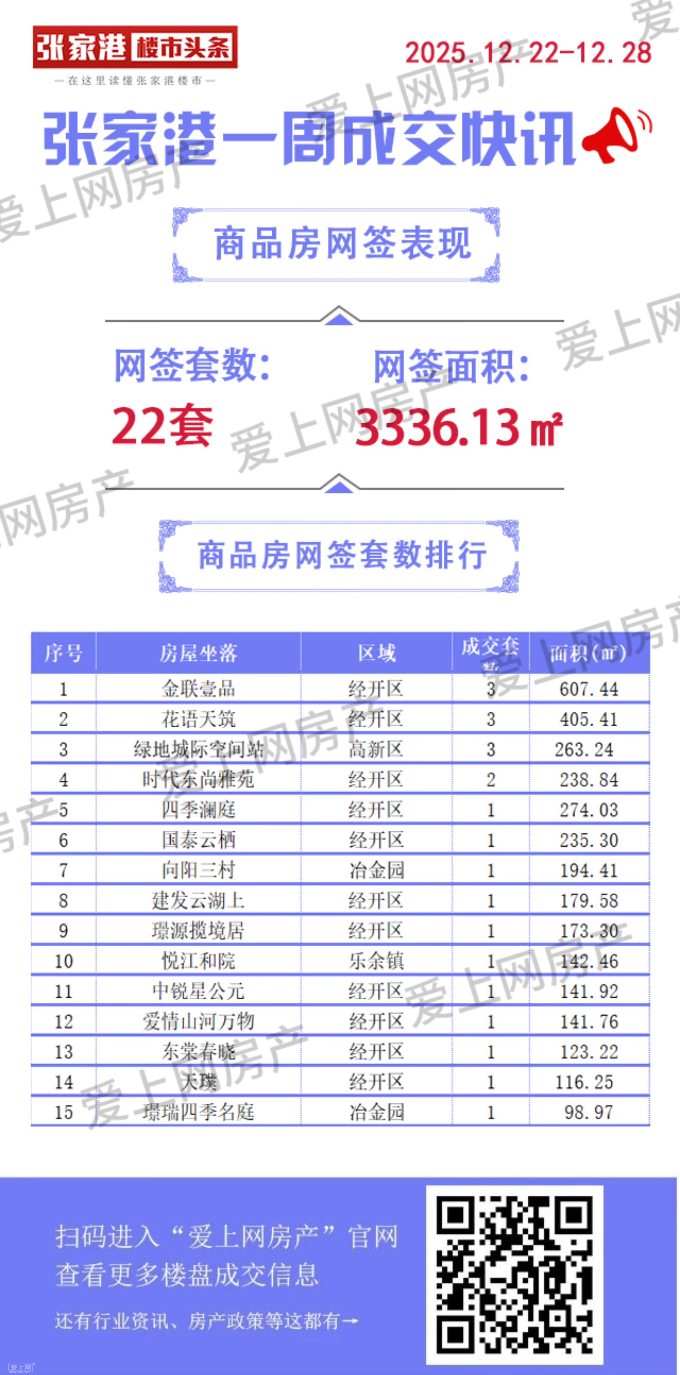 據張家港愛上網房產統計,2025年12月22日-2025年12月28日張家港商品房共網簽22套,面積3336.13平方米。