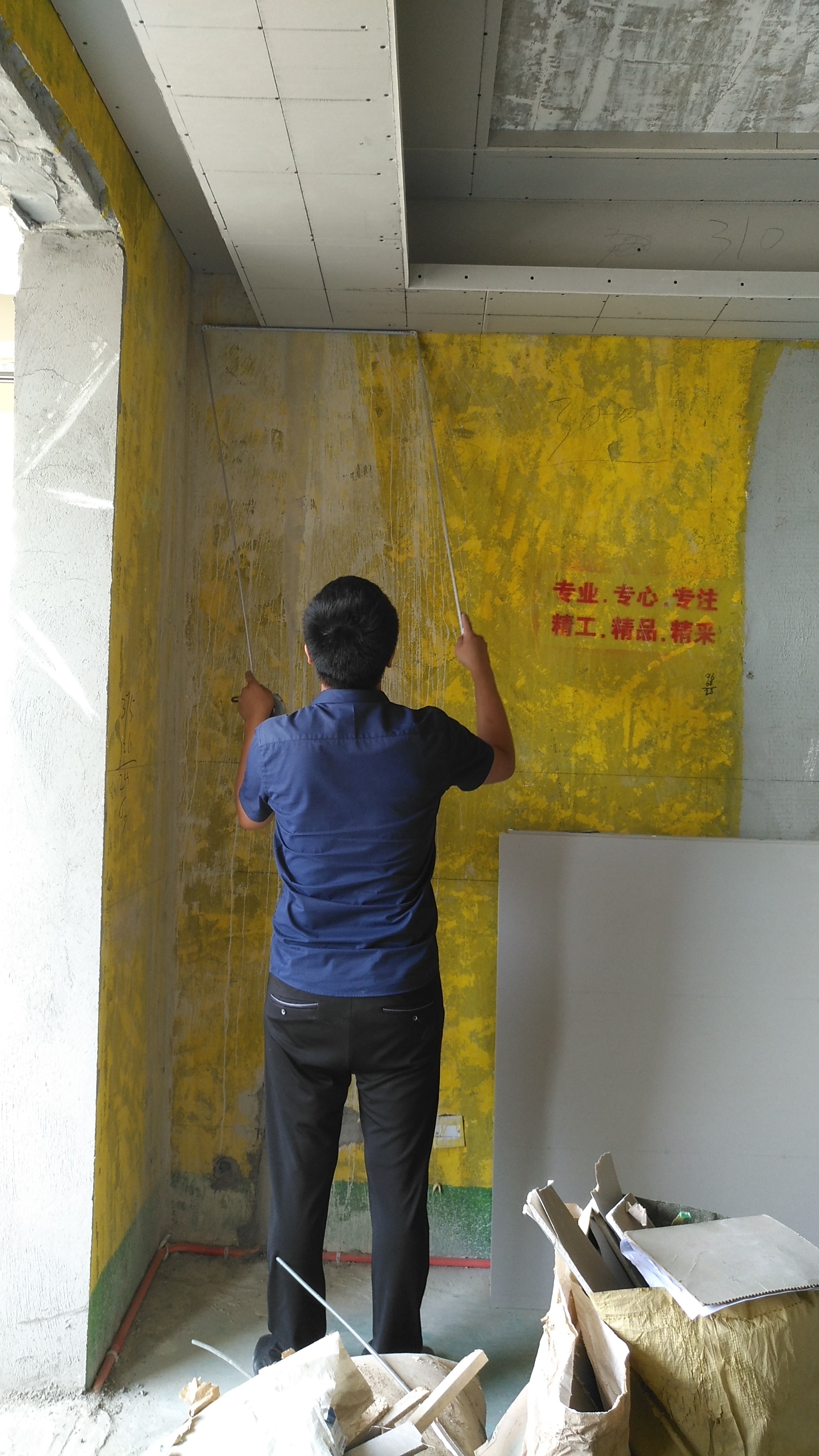 高溫襲擊加上地磚還沒弄好,于是停工了大概半個(gè)月了。今天又開工了,項(xiàng)目經(jīng)理說先做一遍油漆,省的地磚貼了,衛(wèi)生不好搞。于是今天開始油漆了。![]() |